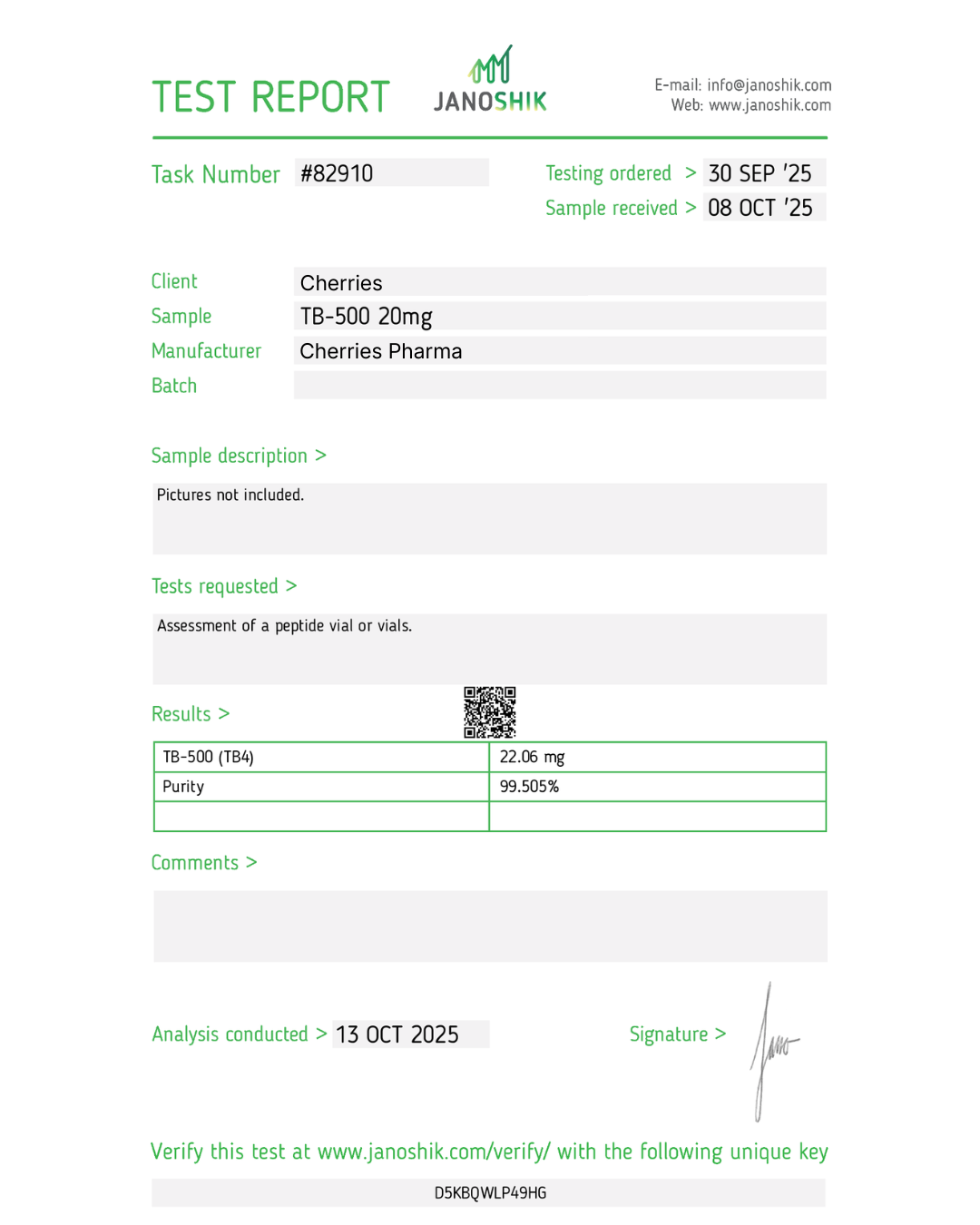 At Cherries, quality and control are central to our operations. Our TB-500 is manufactured in California, USA, and processed exclusively through our own in-house pharmacy and fulfillment center. From manufacturing and quality assurance to packaging and shipment, every stage is managed internally to ensure accuracy, traceability, and product integrity.